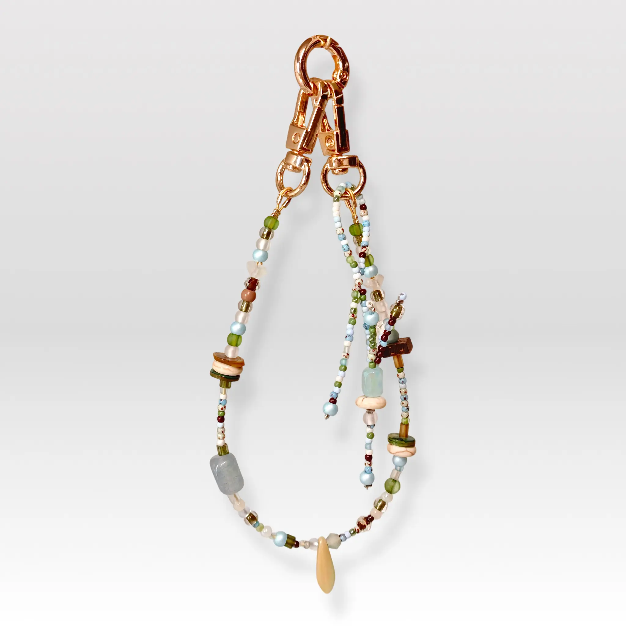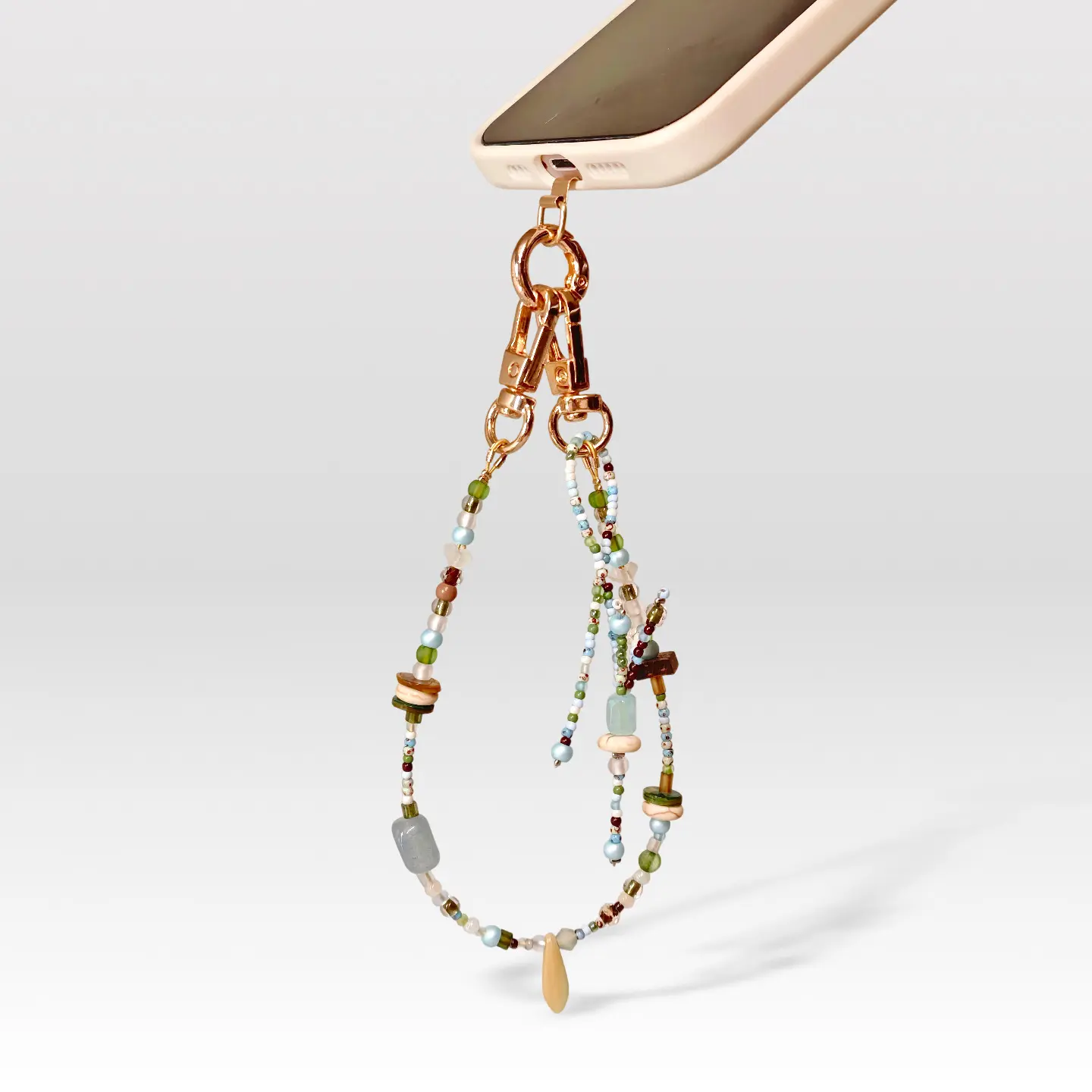The Bloom&Breeze short Chain is a handcrafted phone chain made with Glass Beads, thoughtfully designed to reflect natural forest system.