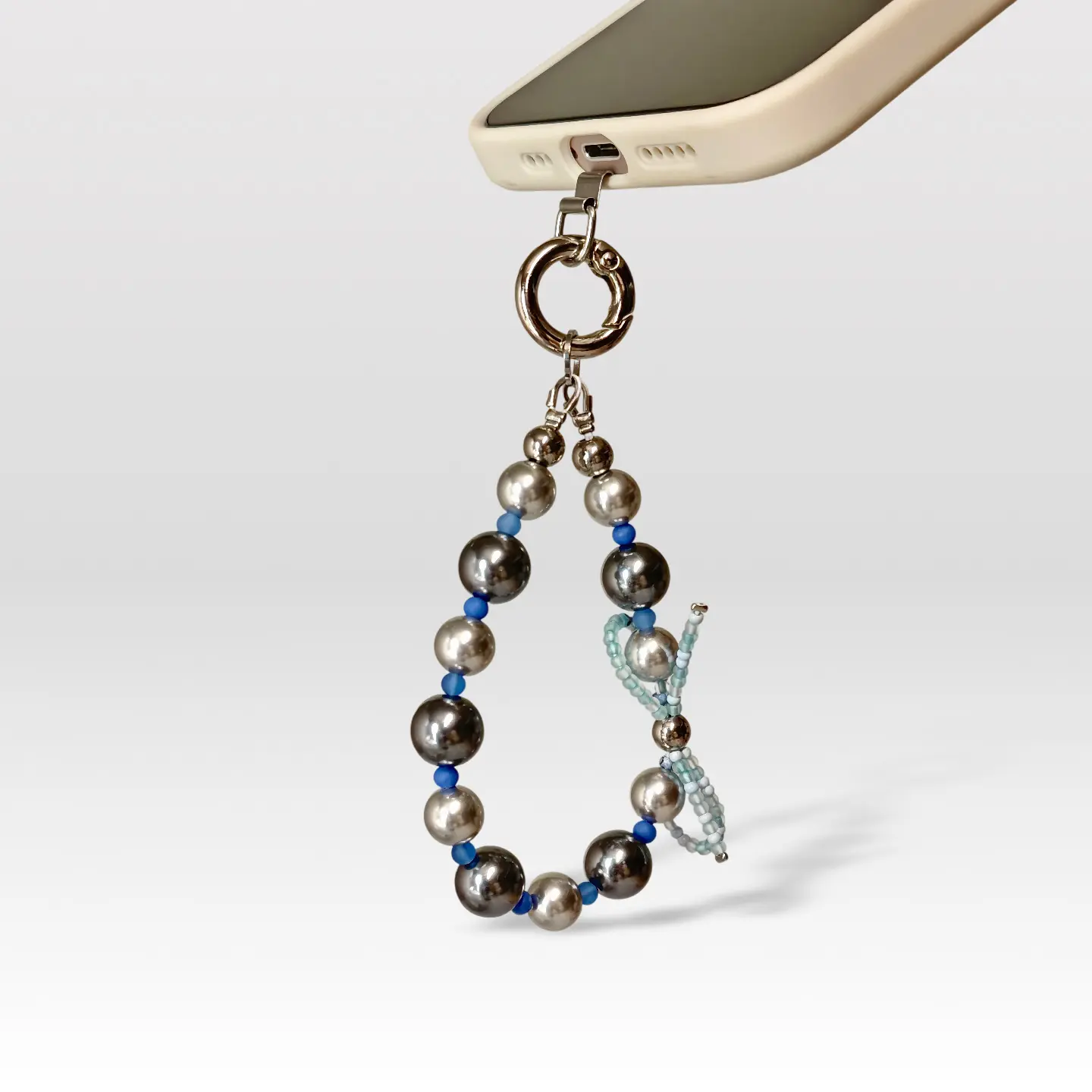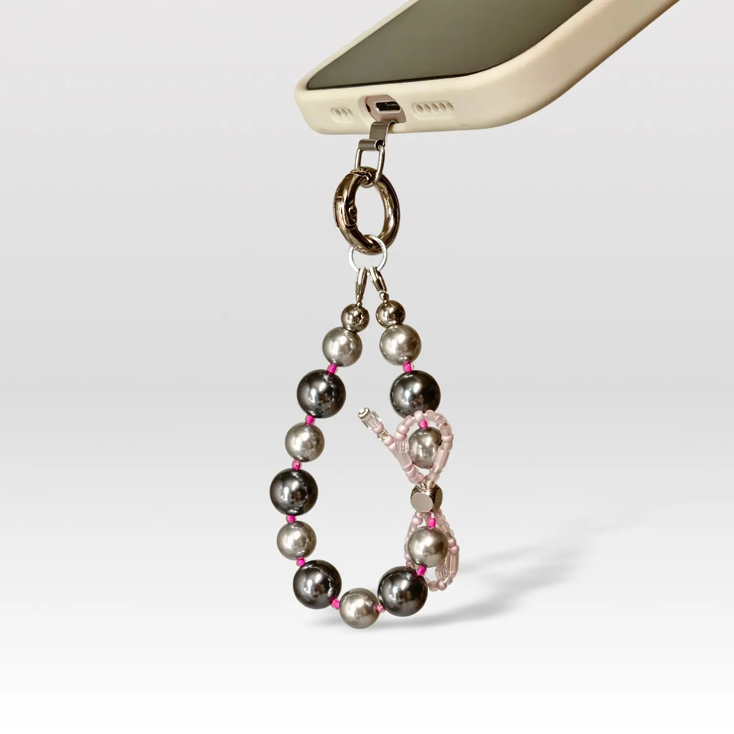 A handmade phone chain featuring Korean Pearl, designed to add sophistication to your everyday phone.