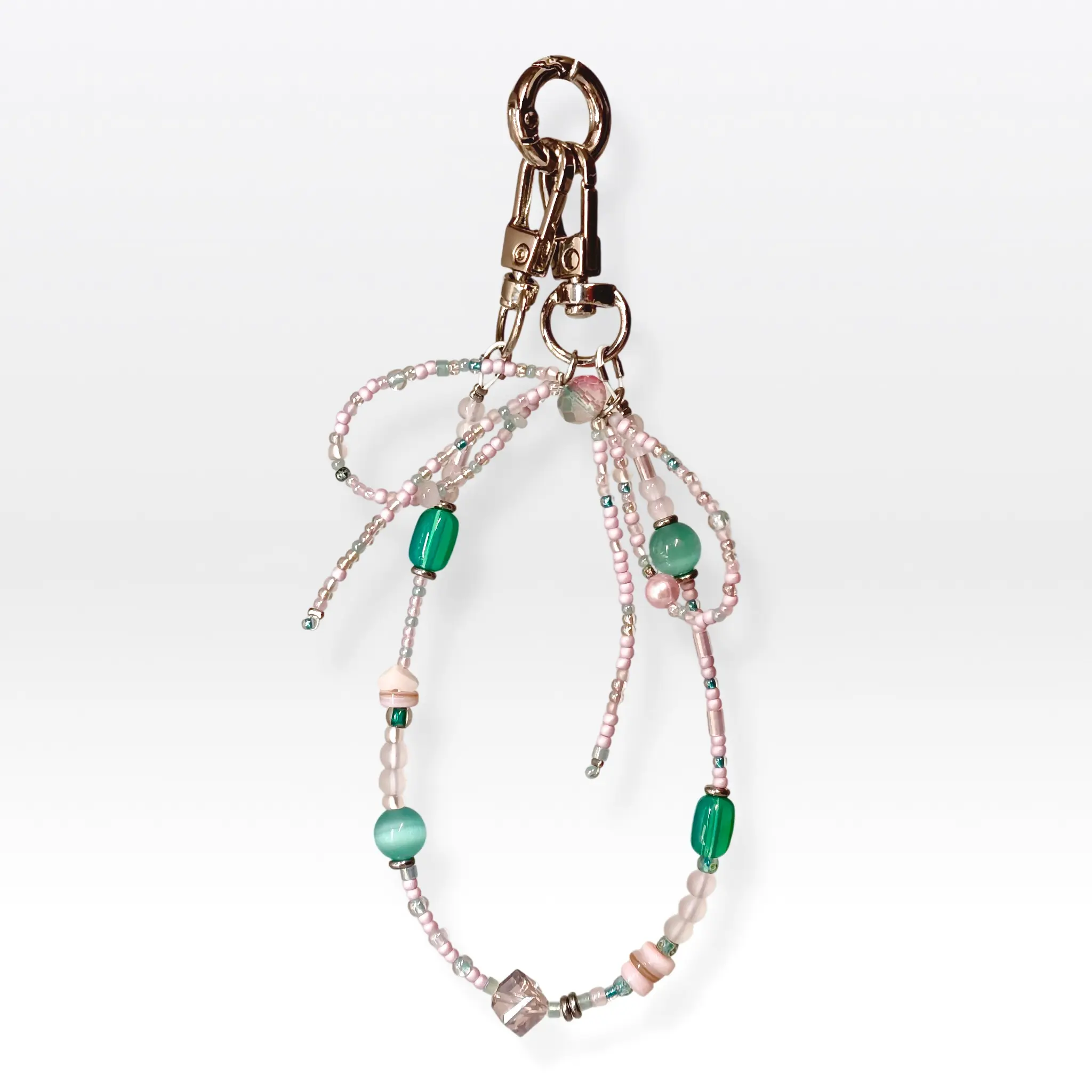 A handmade phone chain featuring Glass Beads, designed to add girlishness and sophistication  to your everyday phone.