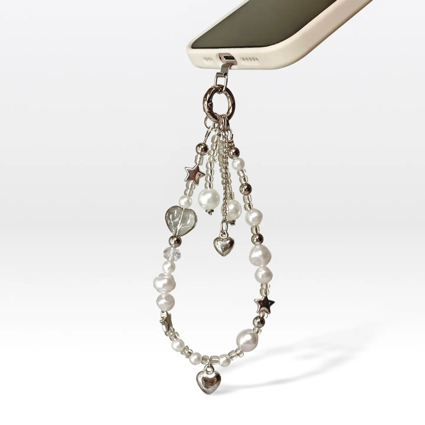 The Moonlight Heart short Chain is a handcrafted phone chain made with Pearlescent Beads, thoughtfully designed to reflect glossy moonlight.