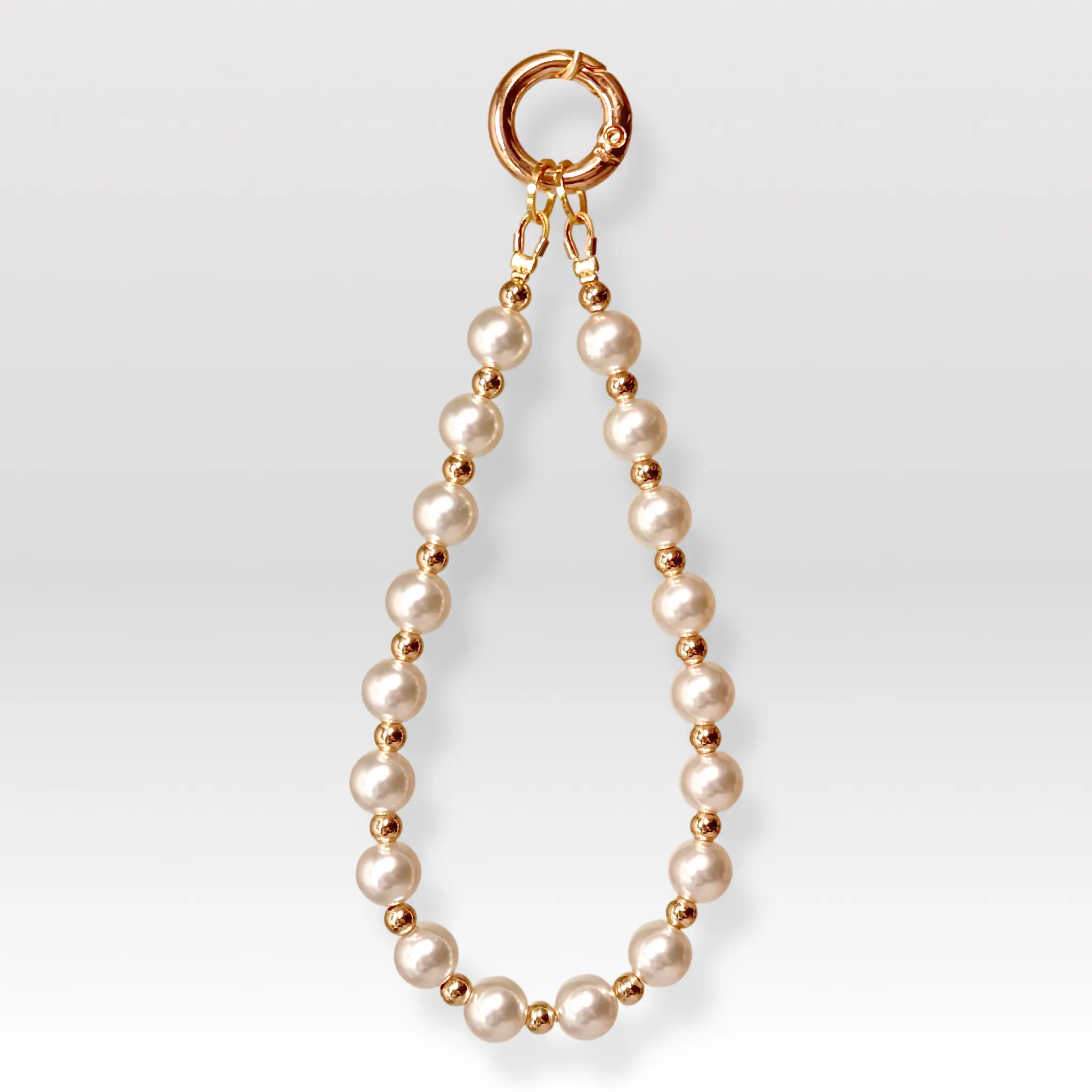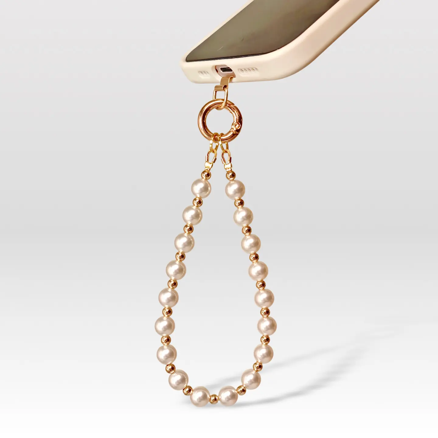 A handmade phone chain featuring Korean Pearl, designed to add Lady and Refined to your everyday phone.